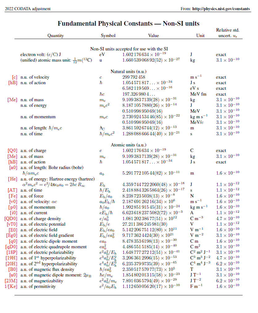 Color print 1280 X 960 GIF B & W print Table only print Tutorial back Values table Atomic constants map, Tutorial next Wedges as displacement into the fourth dimension =================================++================================= 540: Bailey, K, "Symbols and Units in First-Year Physics", The Physics Teacher, vol 37, Jan, 1999, p 38 C:D:t,U:!!(BY YEAR'S END, STUDENTS WILL HAVE SEEN USE OF 52 SYMBOLS [MANY IN GREEK] FOR 35 UNITS HAVING TO DO WITH 60 QUANTITIES, SOME ENTITIES WITH MORE THAN ONE SYMBOL, A SYMBOL FOR A QUANTITY HERE THAT MAY BE A SYMBOL FOR A UNIT THERE, THEY WILL SEE SUBSCRIPTS, AND THEY WILL SEE EMPHASIS IN LETTERS OF WHATEVER LANGUAGE THROUGH ITALICS, BOLD PRINT, AND VECTOR ARROWS ABOVE SYMBOLS, ALL USED ON PAPER, BLACK OR WHITEBOARDS, AND ELECTRONIIC DISPLAYS VIA MULTIPLE AUTHORS EMPLOYING DIFFERING SETS OF SYMBOLS, ALL IN A PHYSICS THAT STILL INVOLVES MORE THAN ONE SYSTEM OF UNITS!) =================================++================================= The conventions adopted for GDA are meant to accommodate greater density of information display without use of italics, subscripts, superscripts, multiple fonts, foreign language symbols, or graphics while bestowing searchability here or across the entire internet. If half of the 52 symbols used for English might later be deemed ambiguous in shape, there are still many more than ([26]^3) label possibilities available for up to three symbols in brackets: [Gye] = Gyromagnetic ratio of the electron, [4Pi] = Four times Pi, [qD0] = Atomic unit of electric quadrupole moment, [p] = momentum, [c^2] = Square of speed of light, etc. If four letters are used to identify a unit, then with or without parentheses, brackets, braces, or slash marks these rules can apply AND be used in conjunction with established standards of expression: 1. A capitalized first letter means a positive exponent, if the first letter is not capitalized then the unit has a negative power. 2. Numerals in the second and third positions of the four letter unit label denote the numerator and denominator of the fractional power to which the unit is raised, and lack of a numeral in either internal position correlates to the presence of numeral one: Ampere : Ampr Joule: Juul Newton : Nwtn Steradian: Strr Coulomb: Cuul Katal: Katl Ohm : Ohmm Sievert : Svrt Candela: Cnda Lumen: Lmen Pascal : Pscl Tesla : Tsla Farad : Frad Lux : Luxx Radian : Radn Volt : Vltt Gray : Gryy Meter: Metr Second : Scnd Watt : Waat Henry : Hnry Mole : Mool Siemens: Smns Weber : Webr Hertz : Hrtz = scnd = [Scnd]^-1` Smns = ohmm Becquerel: Bcql degrees Kelvin: Degk Kilogram : Kgrm degrees Centigrade: Degc [Joule]^+1 = Juul = J1ul , [Joule]^+2 = J2ul , [Joule]^+3 = J3ul [Joule]^-1 = juul = j1ul , [Joule]^-2 = j2ul , [Joule]^-3 = j3ul [Joule]^[1/2] = J12l , [Joule]^[3/2] = J32l , [Joule]^-[7/2] = j72l Juul = hrtzWaat = H2tzKgrmM2tr = C2ulfrad = A2prHnry = FradV2tt [Farad]^+1 = Frad = F1ad = F11d = Fr1d ; [Farad]^-1 = frad [Meter]^+2 = M21r = M2tr = MetrMetr ; [Meter]^[-1/2] = me2r = m12r [Meter]^2 = [Volt][Second]/[Tesla] : M2tr=ScndtslaVltt [Volt]=[Weber]/[Second] : Vltt=scndWebr=Webr/Scnd=1/Scndwebr [Ampere]=[Weber]/[Henry] : Ampr=Webr/[Henry]=hnry[Weber]=hnryWebr [Watt]=[Volt][Ampere] : [Watt]=[Ampere]/vltt=Vltt/ampr=AmprVltt [Siemens]=[Coulomb]/[Weber] : Smns=Cuulwebr=[cuul^-1]/Webr [Hertz]/[Tesla]=[Coulomb]/[Kilogram] : Hrtztsla=1/ScndTsla=Cuulkgrm [Hertz] = 1/[Second] = [Siemens]/[Farad] : Hrtz=scnd=fradSmns [Second] = [Ohm][Farad] : Scnd=FradOhmm : S2nd=F2adO2mm [Second^2] = [Henry][Farad] : S2nd=FradHnry : Scnd=F12dH12y [Henry] = [Ohm^2][Farad] : Hnry=FradO2mm : H12y=F12dOhmm [Henry] = [Ohm][Second] = [Kilogram][Meter^2]/[Coulomb^2] : Hnry=OhmmScnd=c2ulKgrmM2tr [Farad] = [Coulomb^2][Second^2]/([Meter^2][Kilogram]) : Frad=C2ulkgrmm2trS2nd : F12d=Cuulk12mmetrScnd [Weber^2] = [Joule][Henry] = [Kilogram][Meter^2]/[Farad] : W2br=HnryJuul=fradKgrmM2tr : Webr=H12yJ12l=f12dK12mMetr [Coulomb^2]=[Joule][Farad] : C2ul=FradJuul : Cuul=F12dJ12l [Kilogram]/[Henry] = [Coulomb^2]/[Meter^2] : hnryKgrm=C2ulm2tr For CODATA2022 recommended fundamental constants values, verify that the interconsistency of the International System of Units (or SI) ensures the calculation of any unit in terms of the other units and the calculation of any quantity in terms of the other quantities, as can be seen, for example, in the periodic table of atomic constants: Mass in [Kilogram] : = [Farad][Meter^2][Tesla^2] =FradM2trT2la = (capacitance) X (length^2) X {(magnetic flux density)^2} = (permittivity) X (length^3) X {(magnetic flux density)^2} as in [Me] = {[4Pi][k]}{[a0]^3}{[B0]^2} = {[a0]^3}{[B0]^2}/[Ke] = [Tesla^2][Coulomb^2][Meter^2]/[Joule] =C2uljuulM2trT2la = {(magnetic flux density)^2} X (charge^2) X (length^2) / (energy) as in [Me] = {[B0]^2}[18P] = {[B0]^2}{[Q0]^2}{[a0]^2}/[He] = [Coulomb^2][Henry]/[Meter^2] =C2ulHnrym2tr = (charge^2) X (inductance) / (length^2) = (charge^2) X (permeability) / (length) as in [Me] = {[Q0]^2}[d]/([4Pi]{[aa]^2}[a0]) = [Coulomb^2][Second^2]/([Meter^2][Farad]) =C2ulfradm2trS2nd = (charge^2) X [{(time) / (length)}^2] / (capacitance) = (charge^2) / {(permittivity) X (length) X (velocity^2)} as in [Me] = {[Q0]^2}/([4Pi][k][a0]{[v0]^2}) = [Ampere^2][Ohm][Second^3]/[Meter^2] =A2prOhmmm2trS3nd = (current^2) X (resistance) X (time^3) / (length^2) = (current^2) X (resistance) / {(frequency) X (velocity^2)} as in [Me] = {[i0]^2}[RK]/([2af]{[v0]^2}[2Pi]) = [Coulomb][Second][Tesla] =CuulScndTsla = (charge) X (magnetic flux density) / (frequency) as in [Me] = [Q0][B0]/[2af] = [Weber^2][Farad]/[Meter^2] =FradW2brm2tr = {(magnetic flux)^2} X (capacitance) / (length^2) = {(magnetic flux)^2} X (permittivity) / (length) as in [Me] = {[w0]^2}/({[Pi]^2}[Ke][a0]) =================================++============ ==== ==== ==== ===== For a term of form: [MASS^x][LENGTH^y][TIME^z]{([Meter]/[Farad])^s}: ENTRY has dimensions: x y z s =================================++============ ==== ==== ==== ===== AUN: Ato
