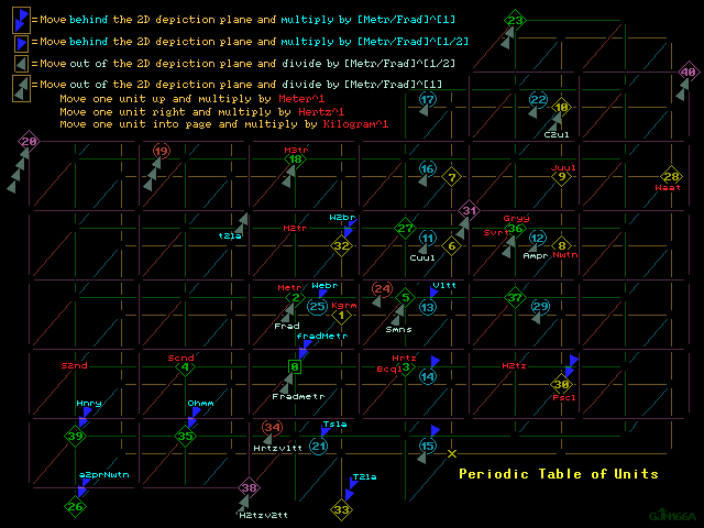 Color print 1280 X 960 GIF B & W print Table only print Tutorial back Values table Atomic constants map, Tutorial next Wedges as displacement into the fourth dimension =================================++================================= 540: Bailey, K, "Symbols and Units in First-Year Physics", The Physics Teacher, vol 37, Jan, 1999, p 38 C:D:t,U:!!(BY YEAR'S END, STUDENTS WILL HAVE SEEN USE OF 52 SYMBOLS [MANY IN GREEK] FOR 35 UNITS HAVING TO DO WITH 60 QUANTITIES, SOME ENTITIES WITH MORE THAN ONE SYMBOL, A SYMBOL FOR A QUANTITY HERE THAT MAY BE A SYMBOL FOR A UNIT THERE, THEY WILL SEE SUBSCRIPTS, AND THEY WILL SEE EMPHASIS IN LETTERS OF WHATEVER LANGUAGE THROUGH ITALICS, BOLD PRINT, AND VECTOR ARROWS ABOVE SYMBOLS, ALL USED ON PAPER, BLACK OR WHITEBOARDS, AND ELECTRONIIC DISPLAYS VIA MULTIPLE AUTHORS EMPLOYING DIFFERING SETS OF SYMBOLS, ALL IN A PHYSICS THAT STILL INVOLVES MORE THAN ONE SYSTEM OF UNITS!) =================================++================================= The conventions adopted for GDA are meant to accommodate greater density of information display without use of italics, subscripts, superscripts, multiple fonts, foreign language symbols, or graphics while bestowing searchability here or across the entire internet. If half of the 52 symbols used for English might later be deemed ambiguous in shape, there are still many more than ([26]^3) label possibilities available for up to three symbols in brackets: [Gye] = Gyromagnetic ratio of the electron, [4Pi] = Four times Pi, [qD0] = Atomic unit of electric quadrupole moment, [p] = momentum, [c^2] = Square of speed of light, etc. If four letters are used to identify a unit, then with or without parentheses, brackets, braces, or slash marks these rules can apply AND be used in conjunction with established standards of expression: 1. A capitalized first letter means a positive exponent, if the first letter is not capitalized then the unit has a negative power. 2. Numerals in the second and third positions of the four letter unit label denote the numerator and denominator of the fractional power to which the unit is raised, and lack of a numeral in either internal position correlates to the presence of numeral one: Ampere : Ampr Joule: Juul Newton : Nwtn Steradian: Strr Coulomb: Cuul Katal: Katl Ohm : Ohmm Sievert : Svrt Candela: Cnda Lumen: Lmen Pascal : Pscl Tesla : Tsla Farad : Frad Lux : Luxx Radian : Radn Volt : Vltt Gray : Gryy Meter: Metr Second : Scnd Watt : Waat Henry : Hnry Mole : Mool Siemens: Smns Weber : Webr Hertz : Hrtz = scnd = [Scnd]^-1` Smns = ohmm Becquerel: Bcql degrees Kelvin: Degk Kilogram : Kgrm degrees Centigrade: Degc [Joule]^+1 = Juul = J1ul , [Joule]^+2 = J2ul , [Joule]^+3 = J3ul [Joule]^-1 = juul = j1ul , [Joule]^-2 = j2ul , [Joule]^-3 = j3ul [Joule]^[1/2] = J12l , [Joule]^[3/2] = J32l , [Joule]^-[7/2] = j72l Juul = hrtzWaat = H2tzKgrmM2tr = C2ulfrad = A2prHnry = FradV2tt [Farad]^+1 = Frad = F1ad = F11d = Fr1d ; [Farad]^-1 = frad [Meter]^+2 = M21r = M2tr = MetrMetr ; [Meter]^[-1/2] = me2r = m12r [Meter]^2 = [Volt][Second]/[Tesla] : M2tr=ScndtslaVltt [Volt]=[Weber]/[Second] : Vltt=scndWebr=Webr/Scnd=1/Scndwebr [Ampere]=[Weber]/[Henry] : Ampr=Webr/[Henry]=hnry[Weber]=hnryWebr [Watt]=[Volt][Ampere] : [Watt]=[Ampere]/vltt=Vltt/ampr=AmprVltt [Siemens]=[Coulomb]/[Weber] : Smns=Cuulwebr=[cuul^-1]/Webr [Hertz]/[Tesla]=[Coulomb]/[Kilogram] : Hrtztsla=1/ScndTsla=Cuulkgrm [Hertz] = 1/[Second] = [Siemens]/[Farad] : Hrtz=scnd=fradSmns [Second] = [Ohm][Farad] : Scnd=FradOhmm : S2nd=F2adO2mm [Second^2] = [Henry][Farad] : S2nd=FradHnry : Scnd=F12dH12y [Henry] = [Ohm^2][Farad] : Hnry=FradO2mm : H12y=F12dOhmm [Henry] = [Ohm][Second] = [Kilogram][Meter^2]/[Coulomb^2] : Hnry=OhmmScnd=c2ulKgrmM2tr [Farad] = [Coulomb^2][Second^2]/([Meter^2][Kilogram]) : Frad=C2ulkgrmm2trS2nd : F12d=Cuulk12mmetrScnd [Weber^2] = [Joule][Henry] = [Kilogram][Meter^2]/[Farad] : W2br=HnryJuul=fradKgrmM2tr : Webr=H12yJ12l=f12dK12mMetr [Coulomb^2]=[Joule][Farad] : C2ul=FradJuul : Cuul=F12dJ12l [Kilogram]/[Henry] = [Coulomb^2]/[Meter^2] : hnryKgrm=C2ulm2tr For CODATA2022 recommended fundamental constants values, verify that the interconsistency of the International System of Units (or SI) ensures the calculation of any unit in terms of the other units and the calculation of any quantity in terms of the other quantities, as can be seen, for example, in the periodic table of atomic constants: Mass in [Kilogram] : = [Farad][Meter^2][Tesla^2] =FradM2trT2la = (capacitance) X (length^2) X {(magnetic flux density)^2} = (permittivity) X (length^3) X {(magnetic flux density)^2} as in [Me] = {[4Pi][k]}{[a0]^3}{[B0]^2} = {[a0]^3}{[B0]^2}/[Ke] = [Tesla^2][Coulomb^2][Meter^2]/[Joule] =C2uljuulM2trT2la = {(magnetic flux density)^2} X (charge^2) X (length^2) / (energy) as in [Me] = {[B0]^2}[18P] = {[B0]^2}{[Q0]^2}{[a0]^2}/[He] = [Coulomb^2][Henry]/[Meter^2] =C2ulHnrym2tr = (charge^2) X (inductance) / (length^2) = (charge^2) X (permeability) / (length) as in [Me] = {[Q0]^2}[d]/([4Pi]{[aa]^2}[a0]) = [Coulomb^2][Second^2]/([Meter^2][Farad]) =C2ulfradm2trS2nd = (charge^2) X [{(time) / (length)}^2] / (capacitance) = (charge^2) / {(permittivity) X (length) X (velocity^2)} as in [Me] = {[Q0]^2}/([4Pi][k][a0]{[v0]^2}) = [Ampere^2][Ohm][Second^3]/[Meter^2] =A2prOhmmm2trS3nd = (current^2) X (resistance) X (time^3) / (length^2) = (current^2) X (resistance) / {(frequency) X (velocity^2)} as in [Me] = {[i0]^2}[RK]/([2af]{[v0]^2}[2Pi]) = [Coulomb][Second][Tesla] =CuulScndTsla = (charge) X (magnetic flux density) / (frequency) as in [Me] = [Q0][B0]/[2af] = [Weber^2][Farad]/[Meter^2] =FradW2brm2tr = {(magnetic flux)^2} X (capacitance) / (length^2) = {(magnetic flux)^2} X (permittivity) / (length) as in [Me] = {[w0]^2}/({[Pi]^2}[Ke][a0]) =================================++============ ==== ==== ==== ===== For a term of form: [MASS^x][LENGTH^y][TIME^z]{([Meter]/[Farad])^s}: ENTRY has dimensions: x y z s =================================++============ ==== ==== ==== ===== AUN: Ato